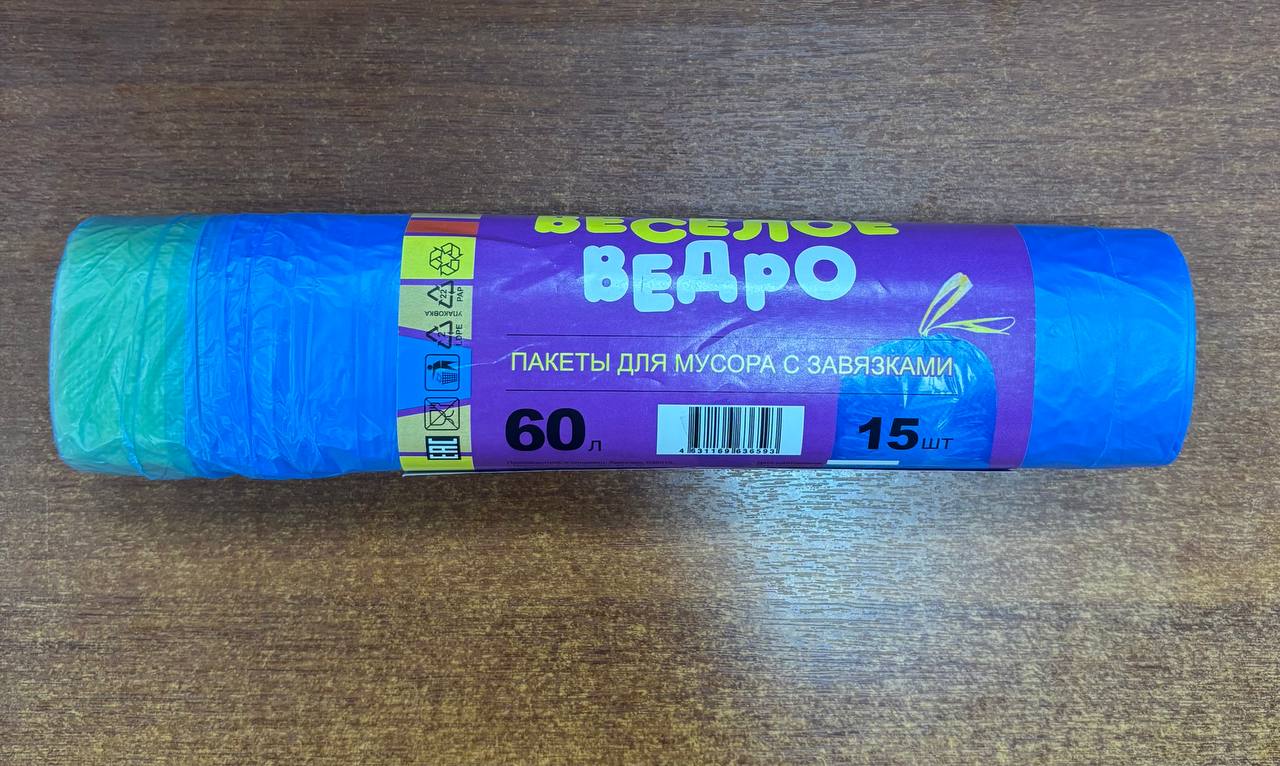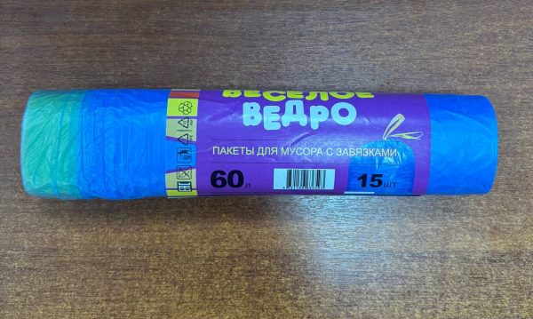 / _Мешки для мусора с завязками 60л Весёлое ведро Люкс 60х70 14мкм (15шт/1рул/25рул)